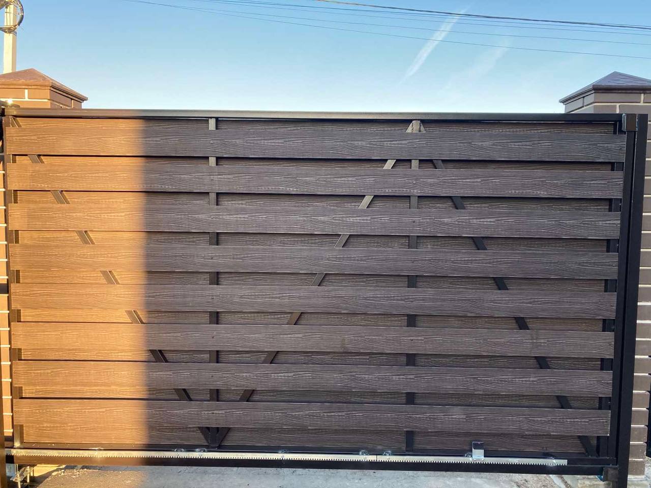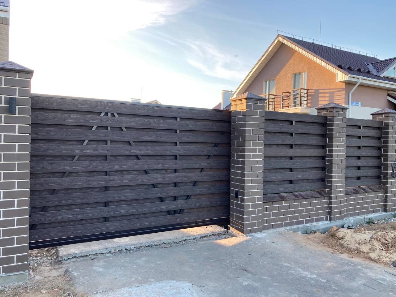 Евроштакетник, профнастил, жалюзи, кирпичные столбы. Ворота распашные и откатные.