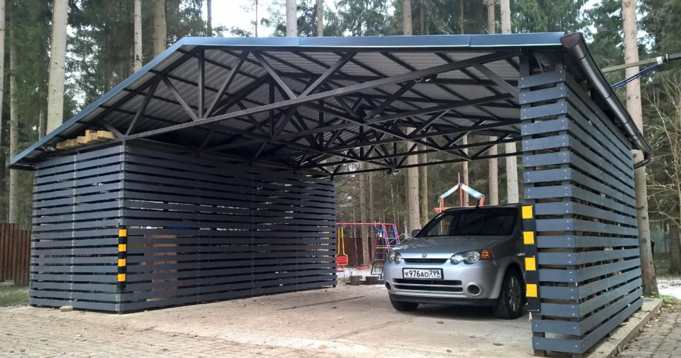 Навес для хранения дров, инвентаря, садовой техники. Открытый или закрытый. Надёжный металлический каркас, кровля из профлиста.