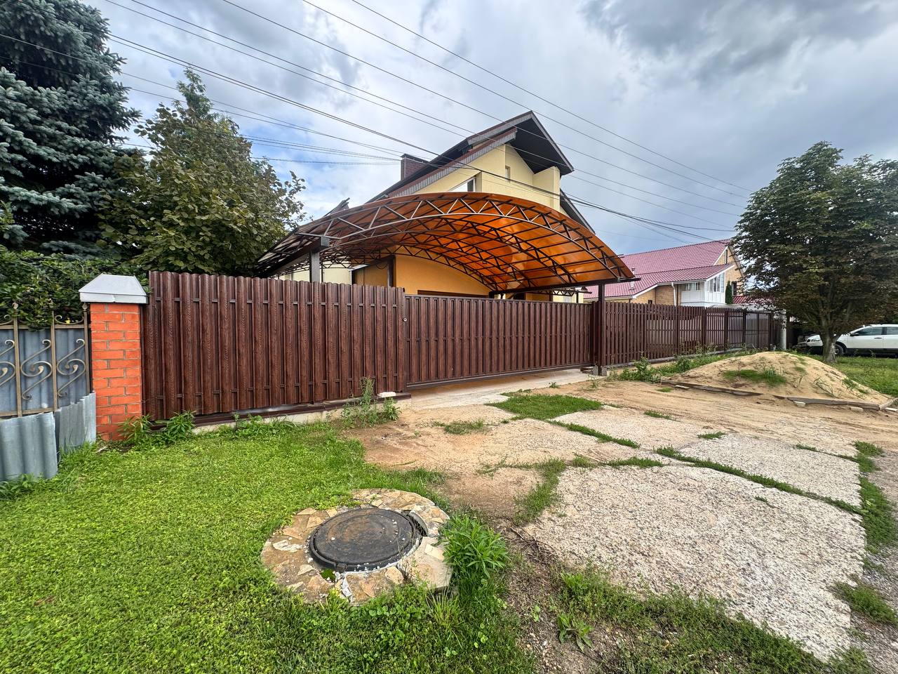 Рекомендуем сотовый поликарбонат толщиной 6–10 мм российского производства. Он лёгкий, пропускает свет и выдерживает снеговую нагрузку НН. Для большей прочности и непрозрачности используем профлист — он дешевле и долговечнее.