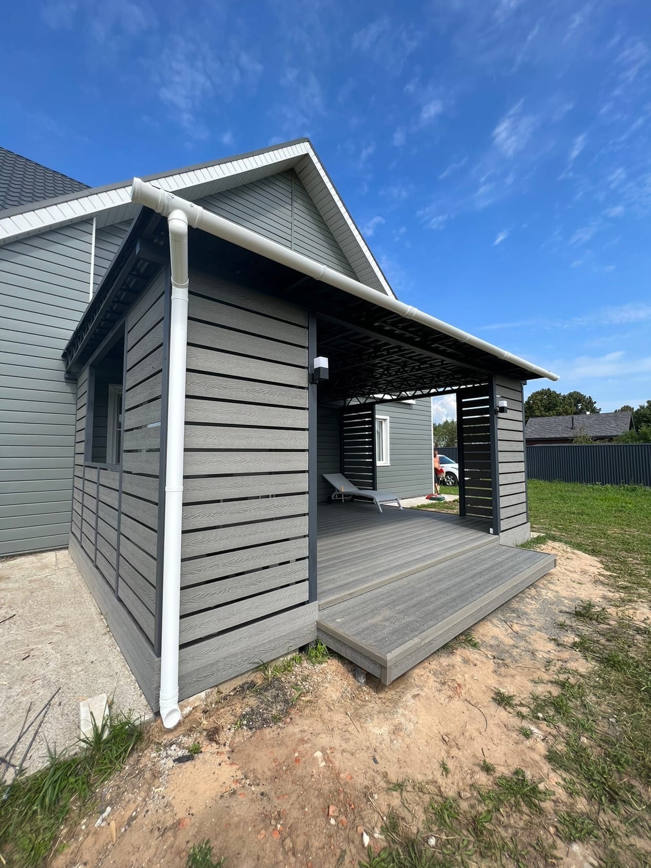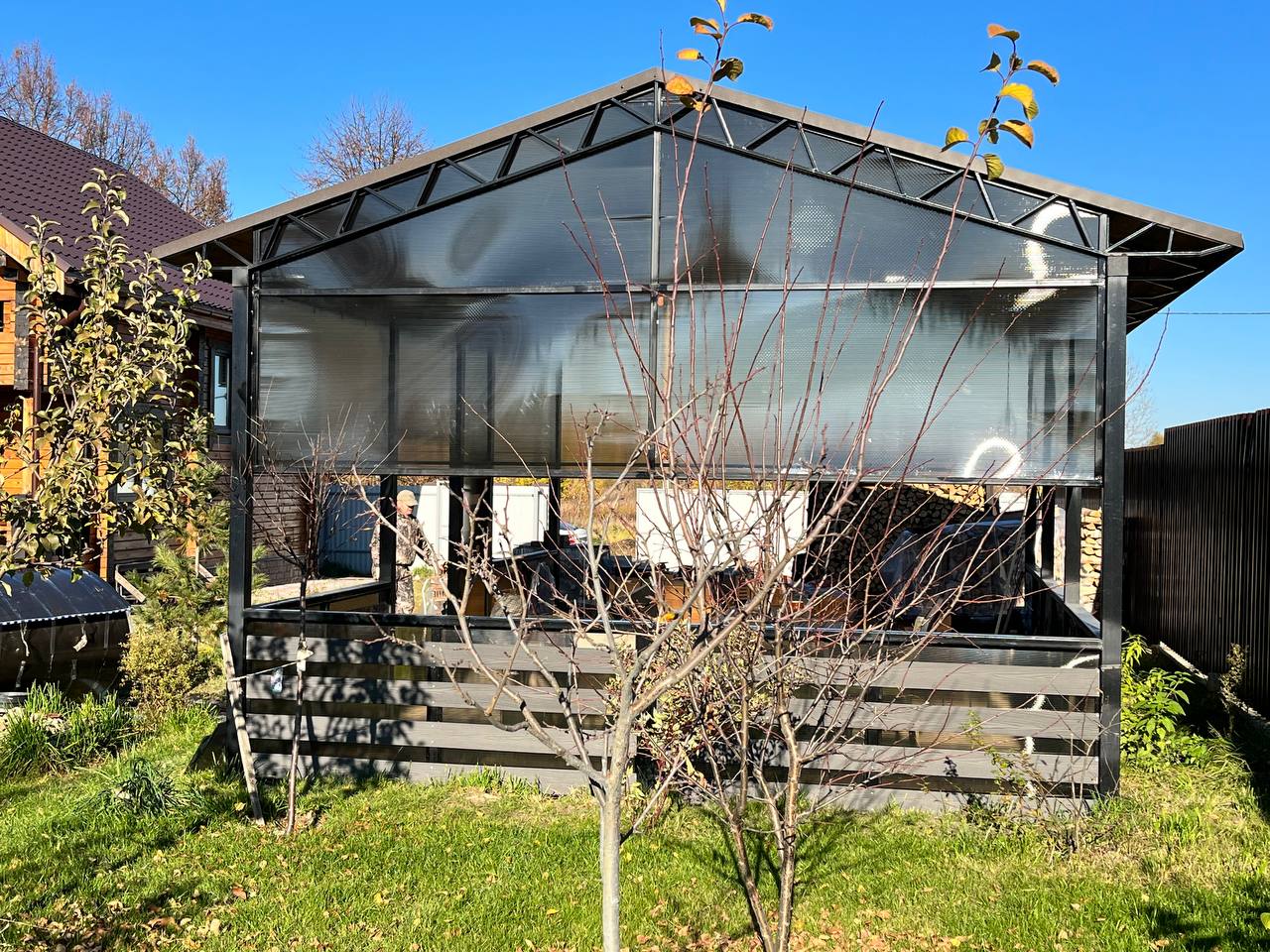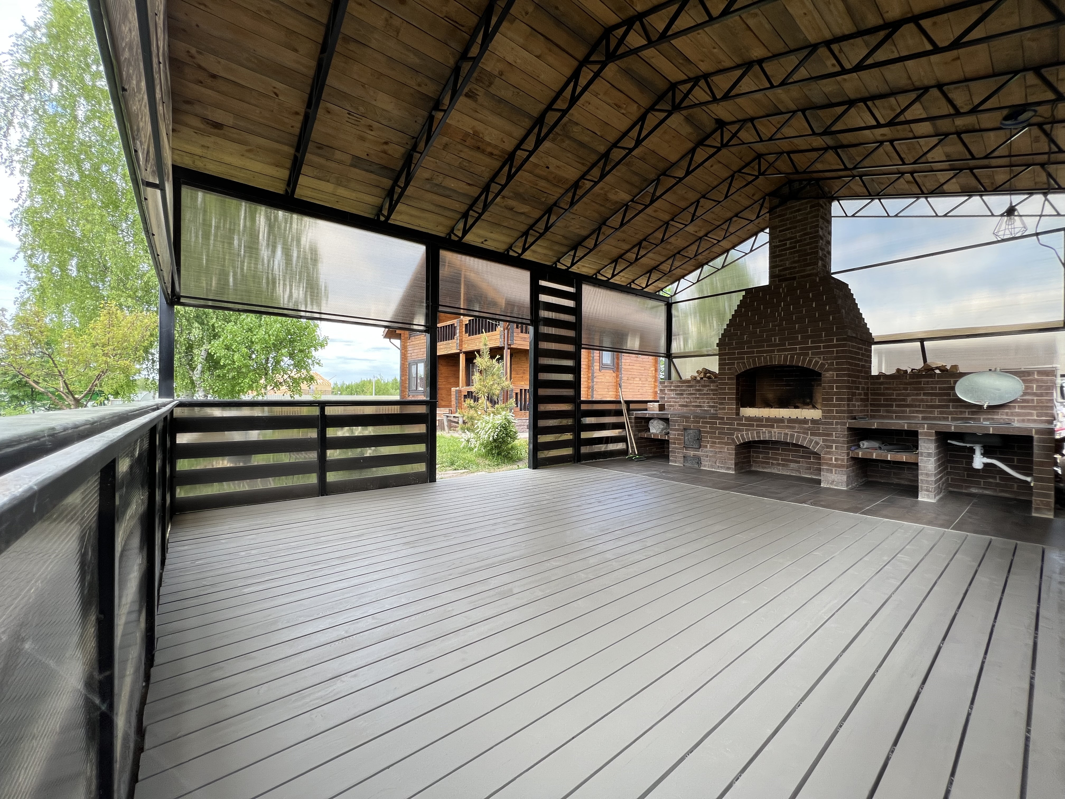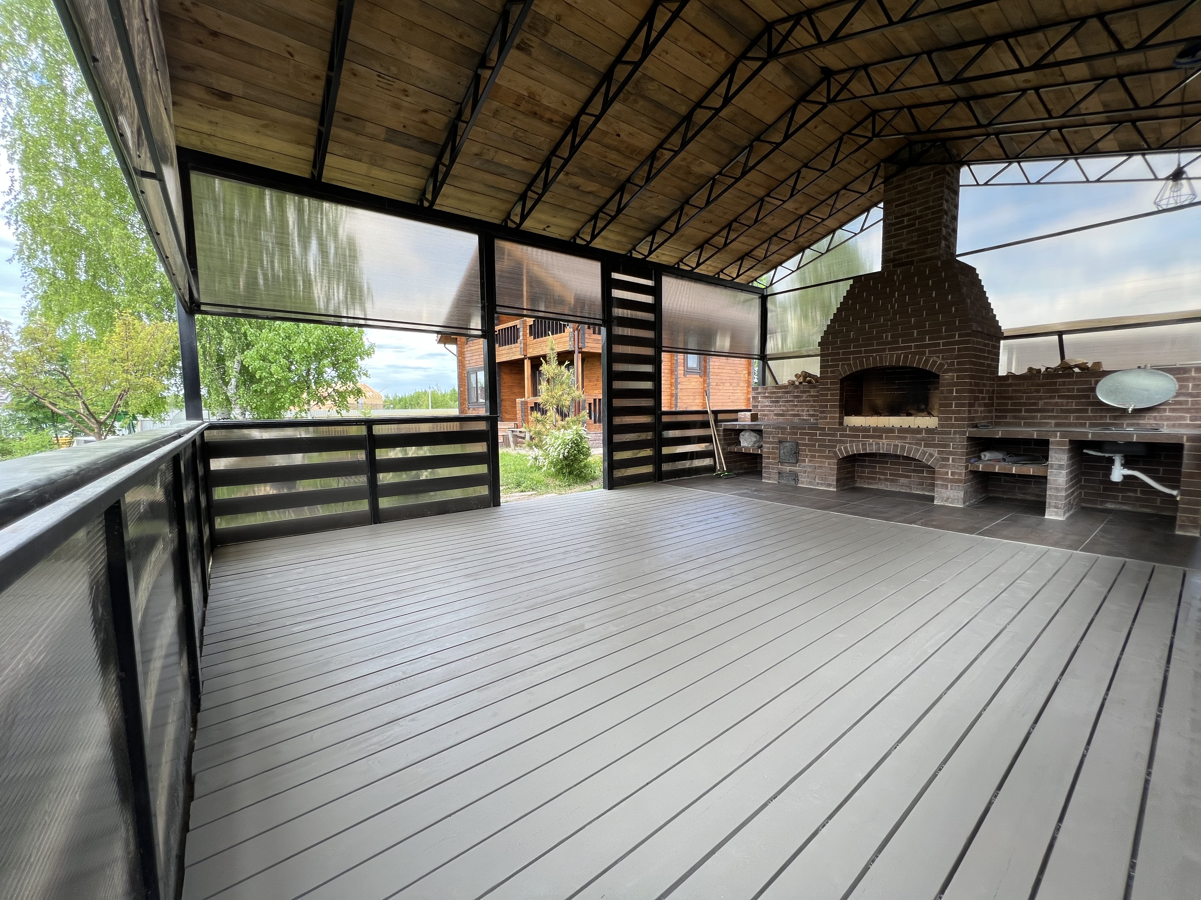 Строим террасы любой сложности: открытые площадки, крытые веранды с поликарбонатом или профлистом, террасы с ДПК настилом у бассейна и дома. Металлический каркас из собственного цеха — окрашиваем в любой RAL за 24 часа.