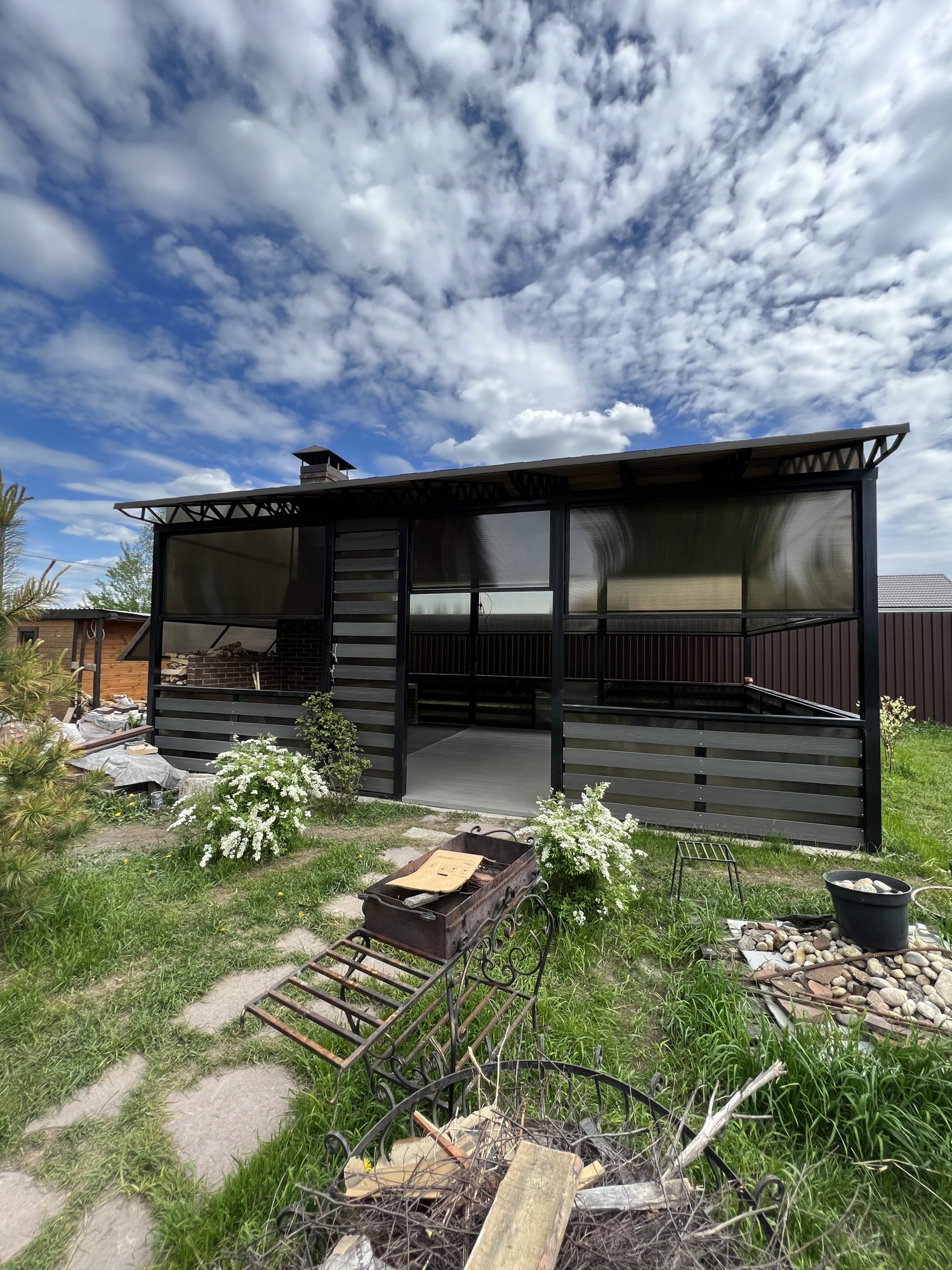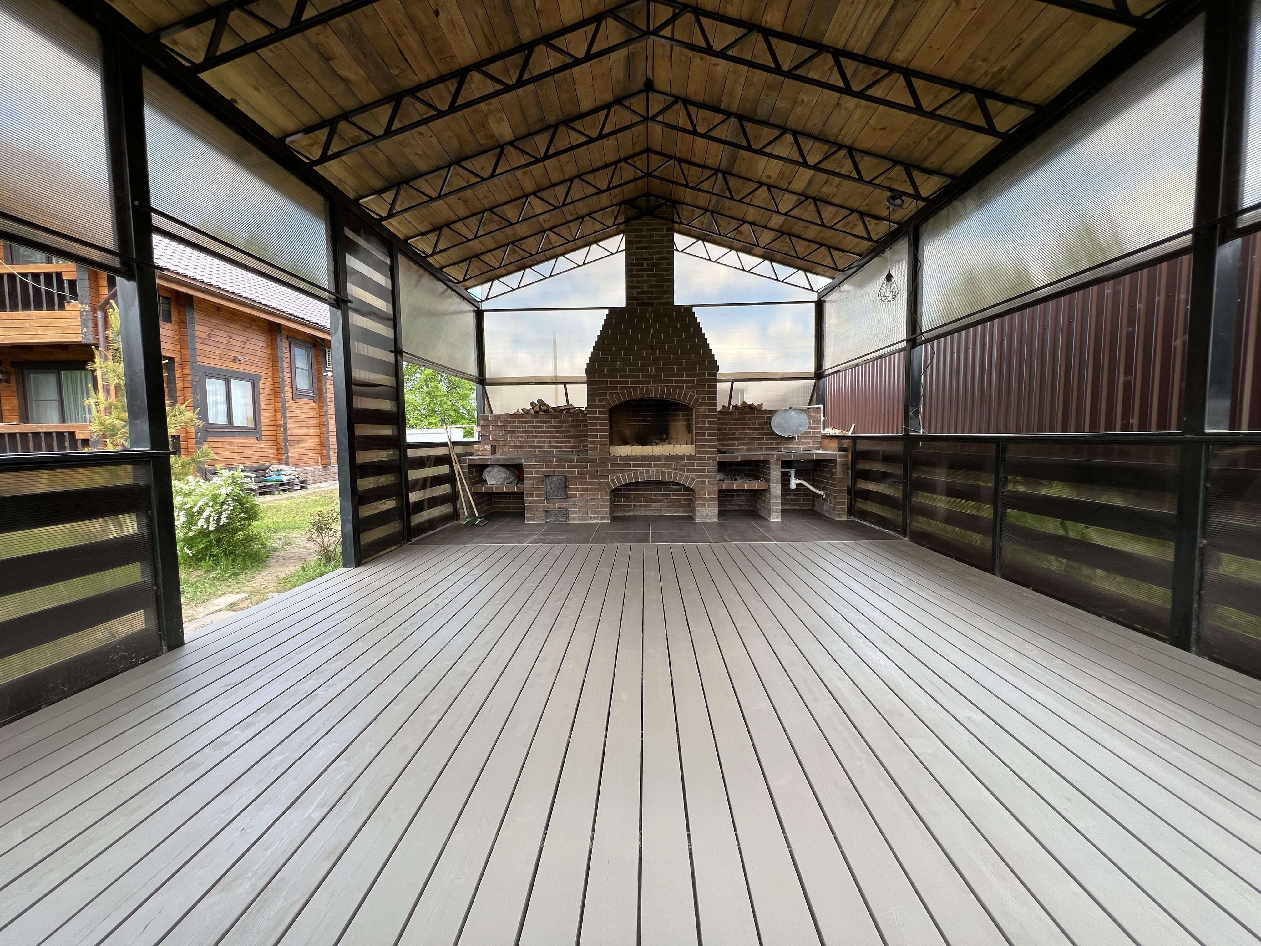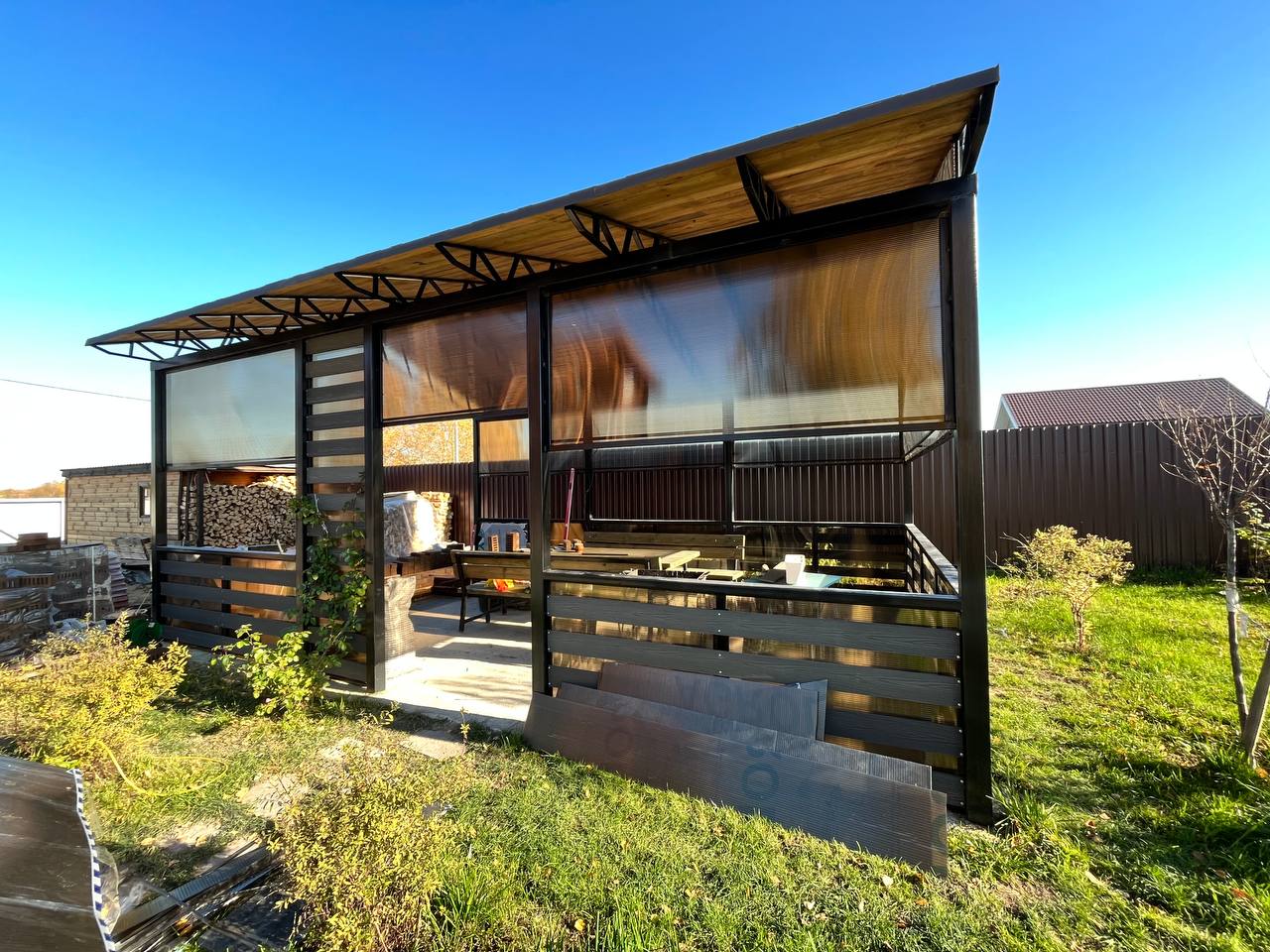 Металлический каркас + кровля из поликарбоната или профлиста. Защита от дождя и солнца. Комфортный отдых в любую погоду. Боковые стенки — опционально.