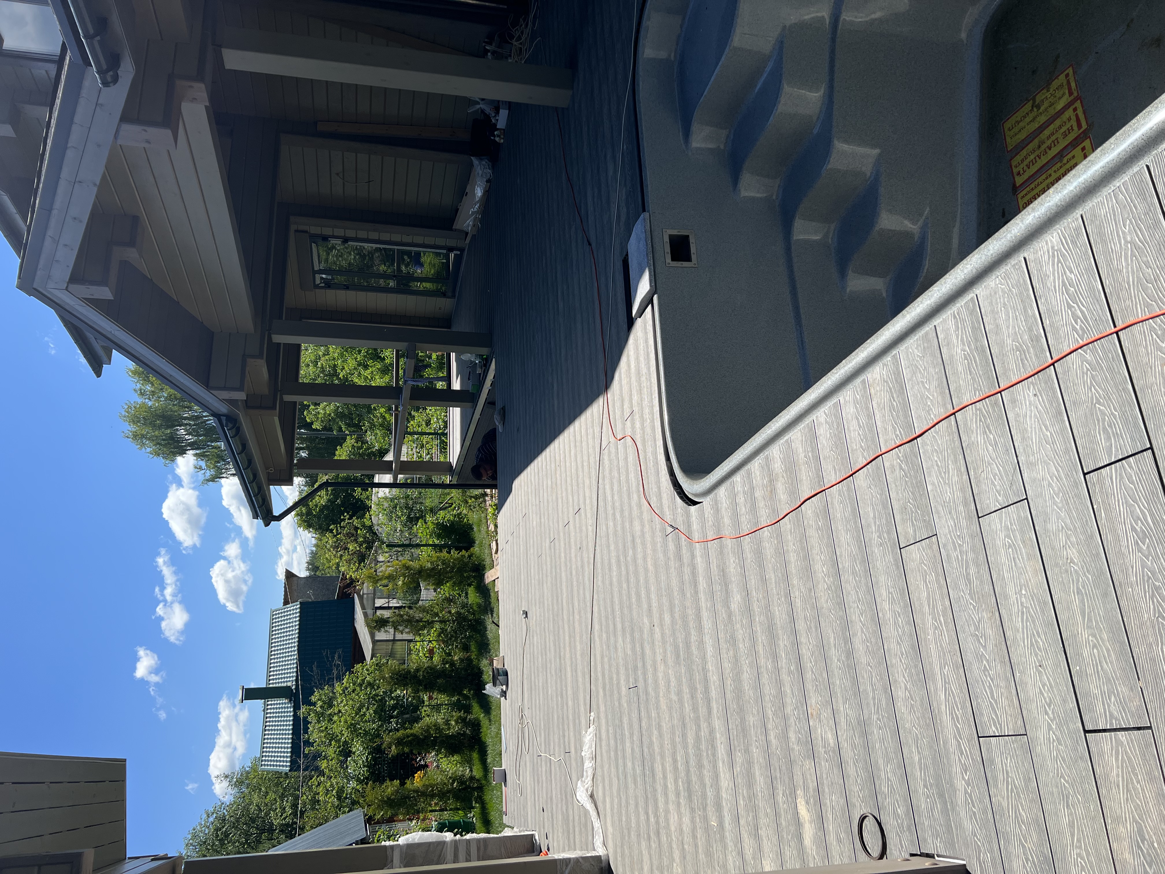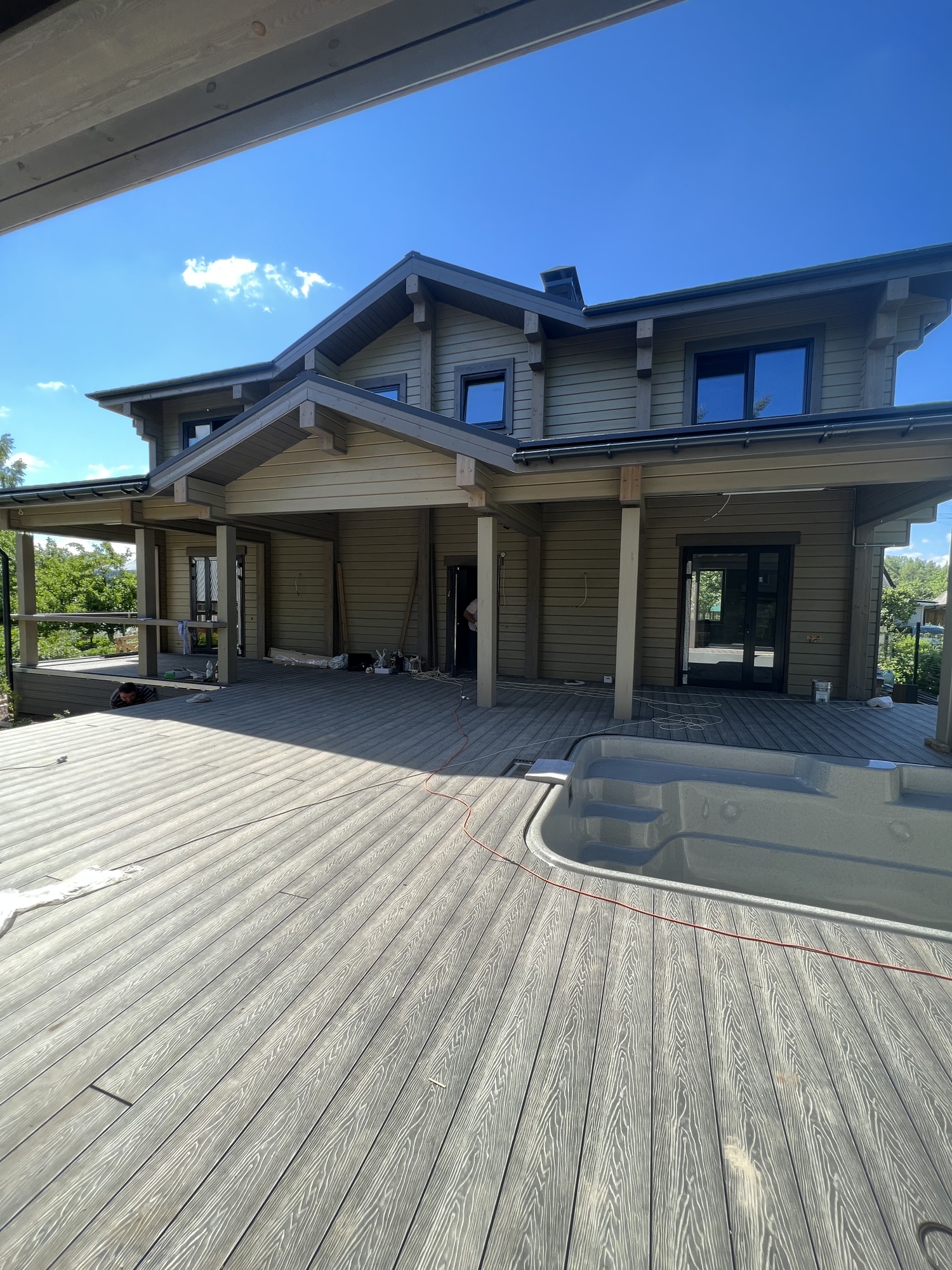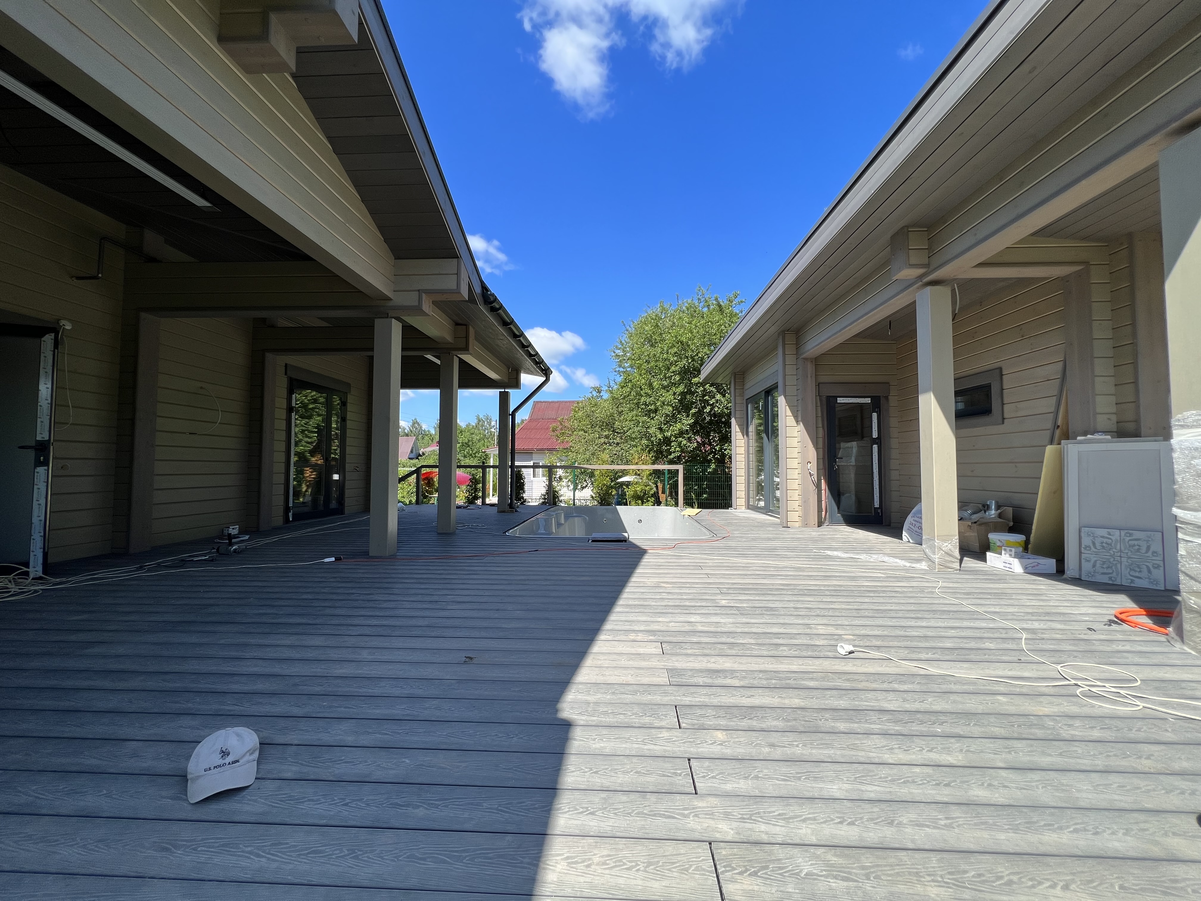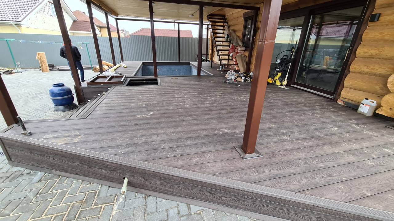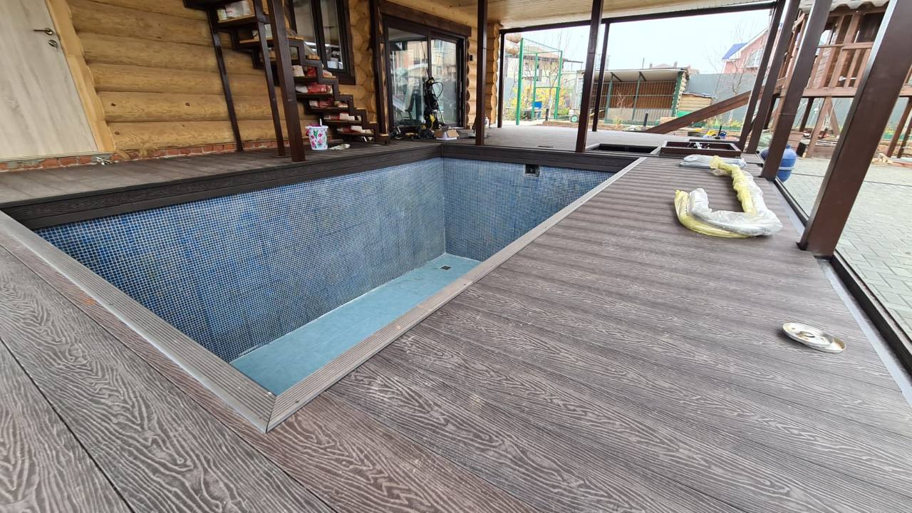 Терраса с антискользящим ДПК настилом вокруг бассейна. Устойчива к влаге, не нагревается на солнце. Перила из металла в тон кровле или забору.