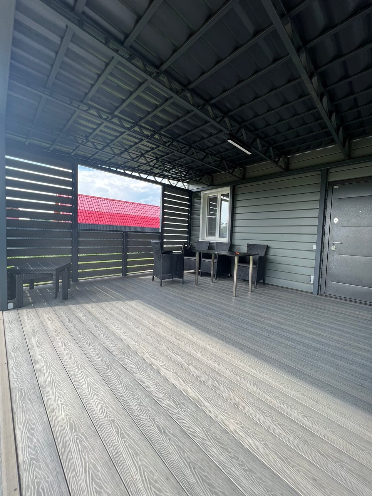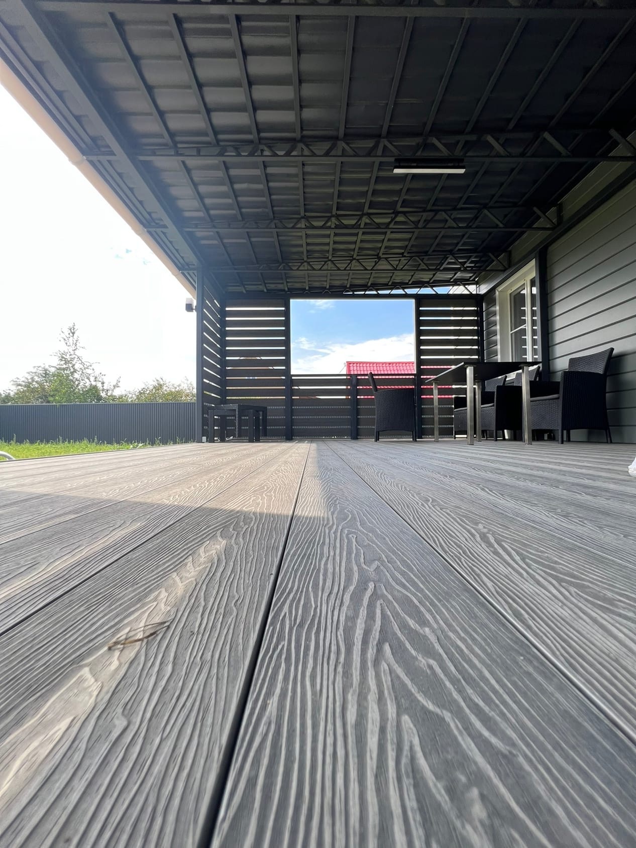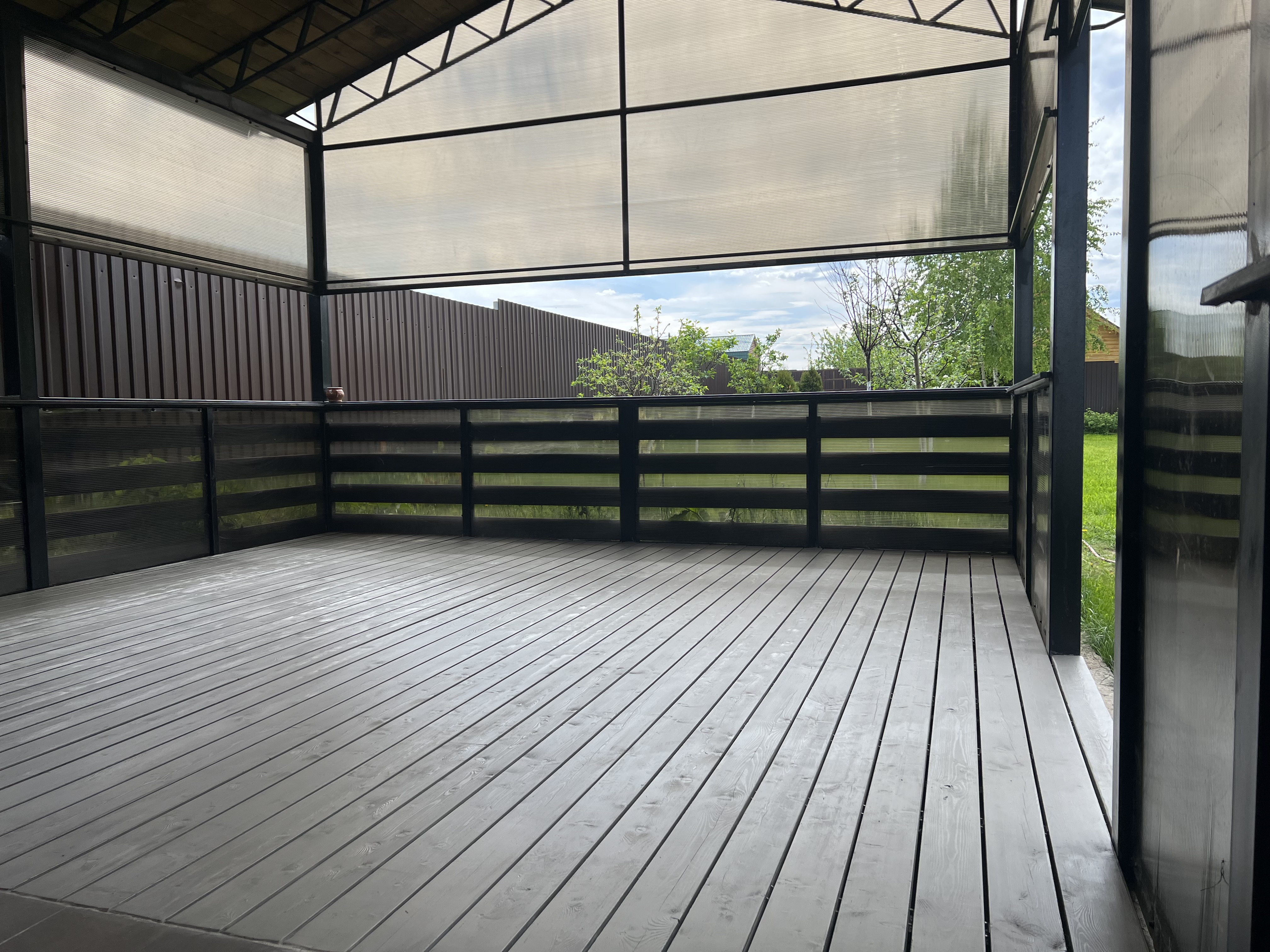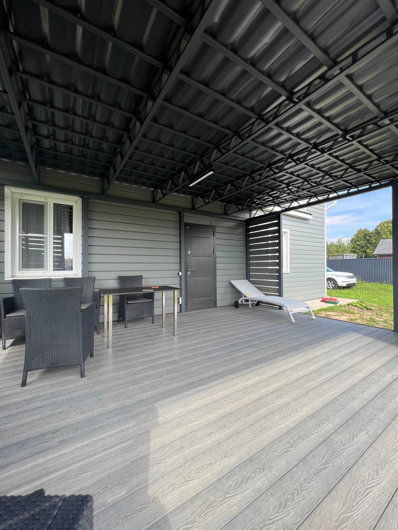 Комбинированное решение: терраса с металлическим навесом из поликарбоната или профлиста. Защита от дождя и солнца, единый каркас — экономия на монтаже.