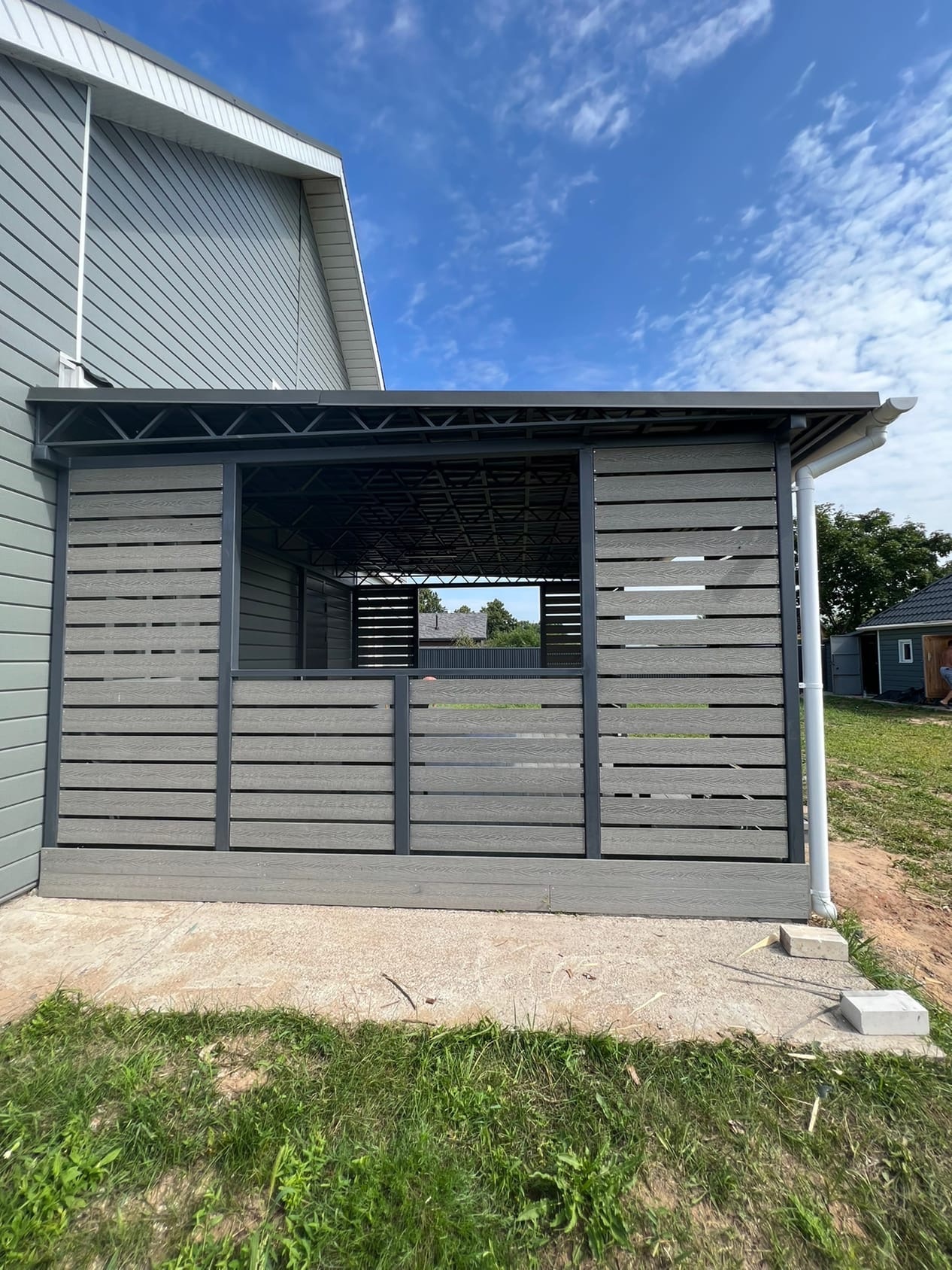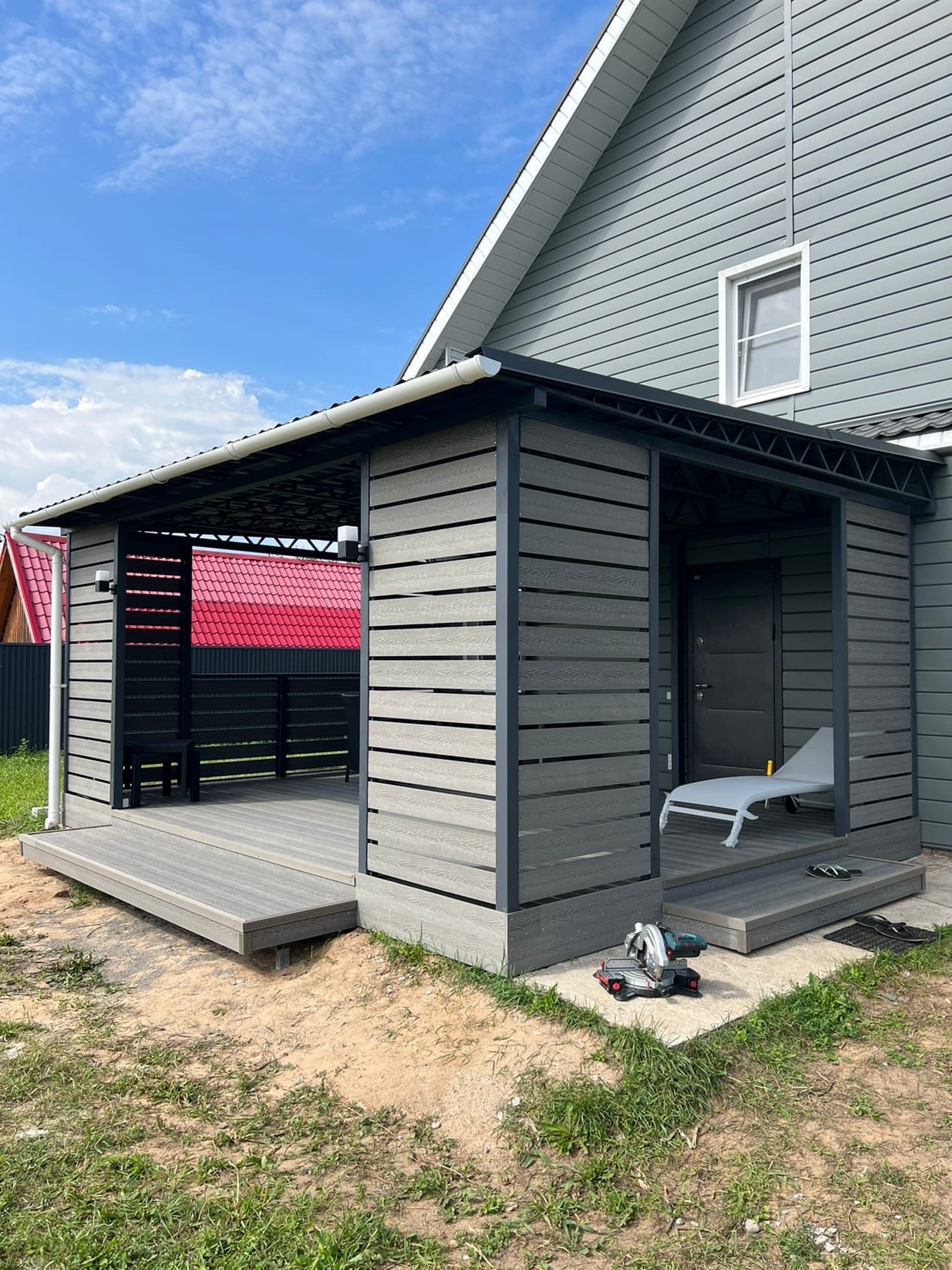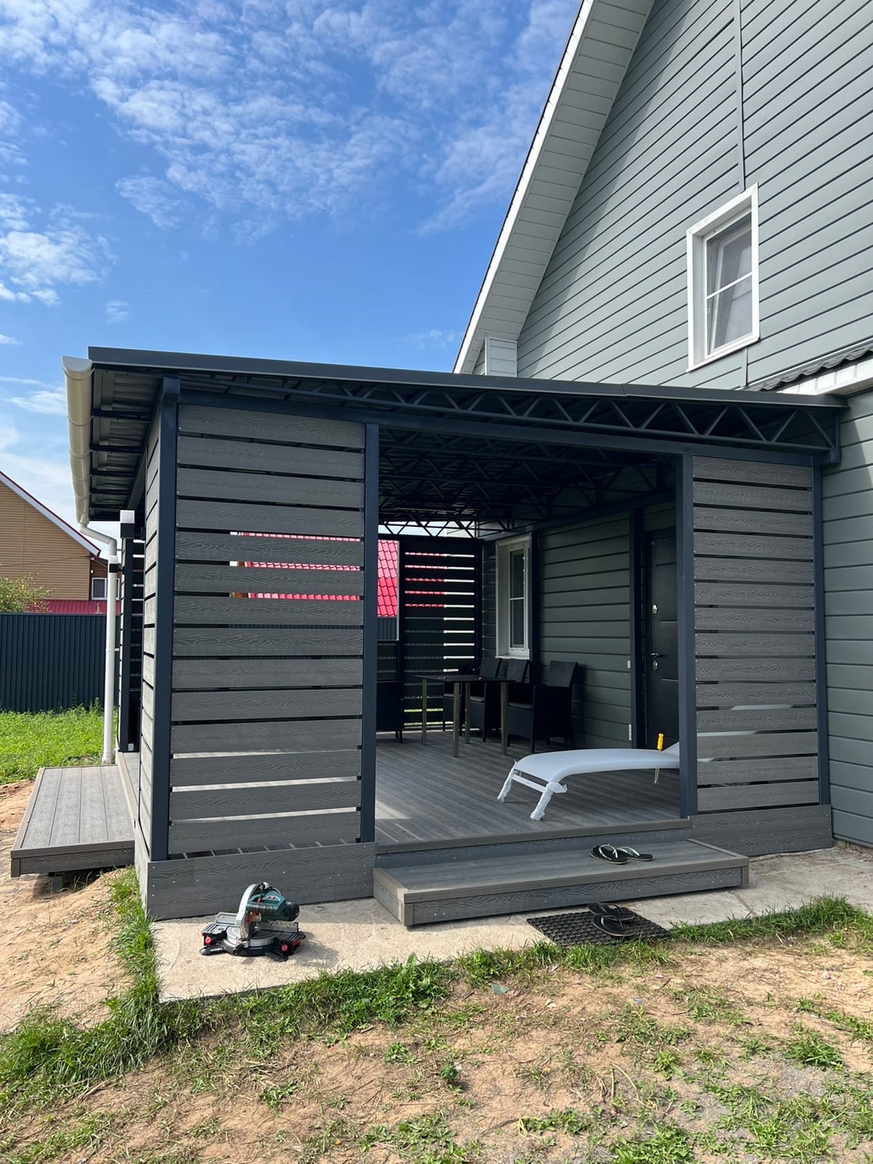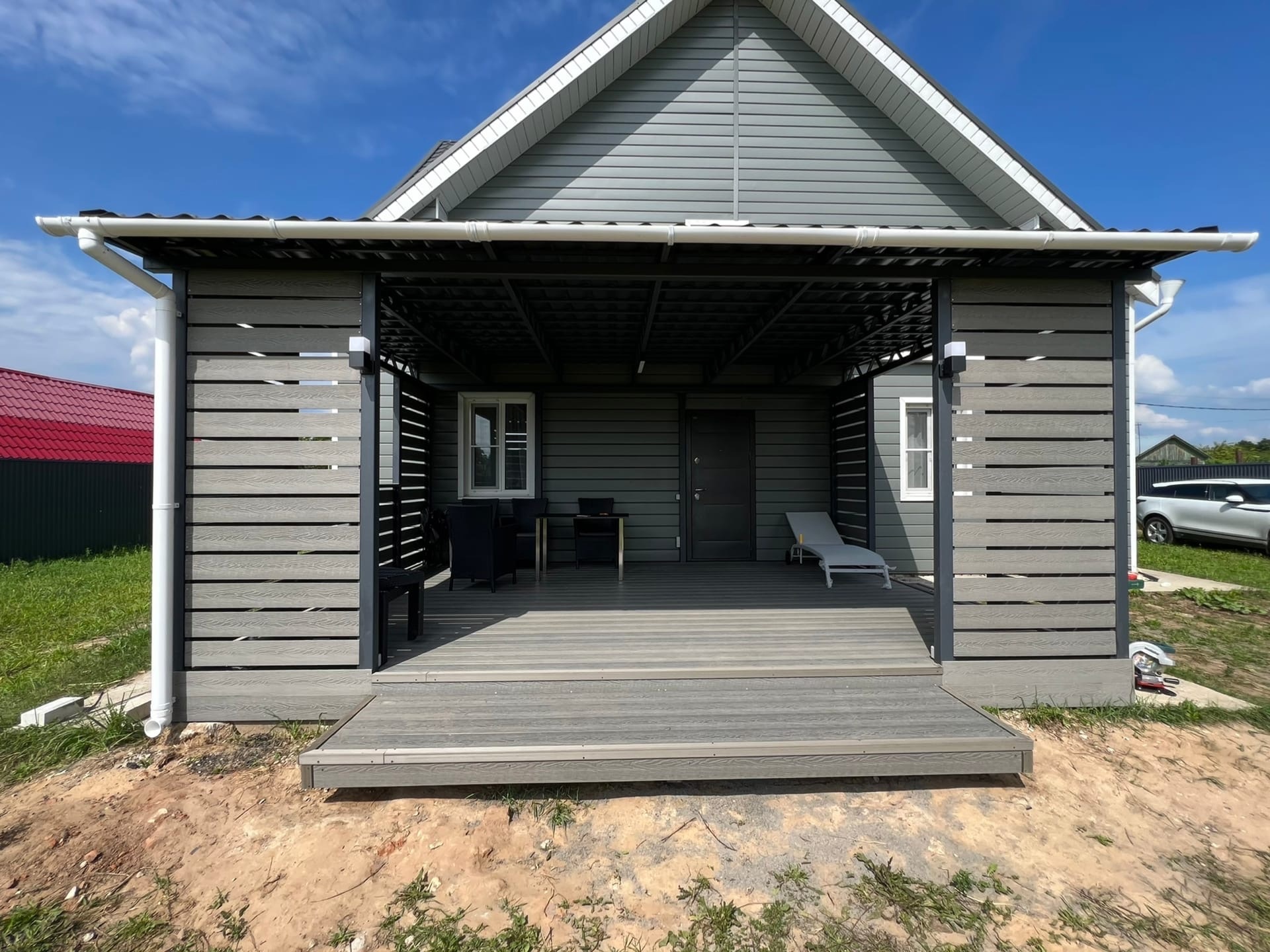 Комбинированное решение: терраса с металлическим навесом из поликарбоната или профлиста. Защита от дождя и солнца, единый каркас — экономия на монтаже.