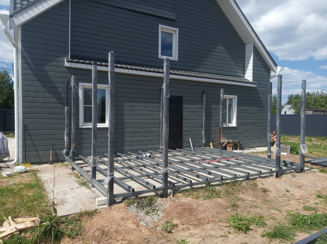 Открытая терраса на металлическом каркасе с настилом — от 90 000 ₽. Крытая терраса с поликарбонатом или профлистом — от 150 000 ₽. Терраса с ДПК настилом — от 200 000 ₽. Точная стоимость зависит от размеров, конфигурации и материалов — рассчитаем бесплатно после замера.