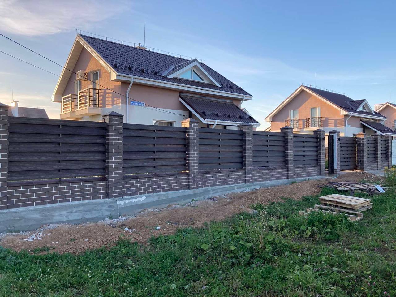 Комбинация кирпичных столбов с металлическими секциями. Самый презентабельный и долговечный вариант для частного дома.